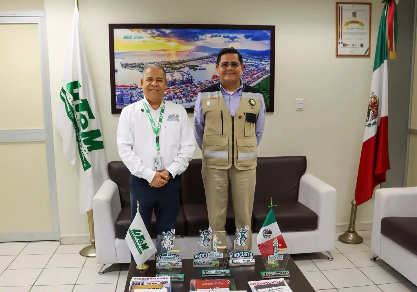 El rector de la Universidad Tecnológica de Manzanillo (UTeM), Mtro. Guillermo Torres López, recibió al Almirante Guillermo Mejía George, director general de la Administración del Sistema Portuario Nacional (ASIPONA) Manzanillo, en el marco de una visita institucional orientada a fortalecer la vinculación entre la Universidad y el sector portuario.